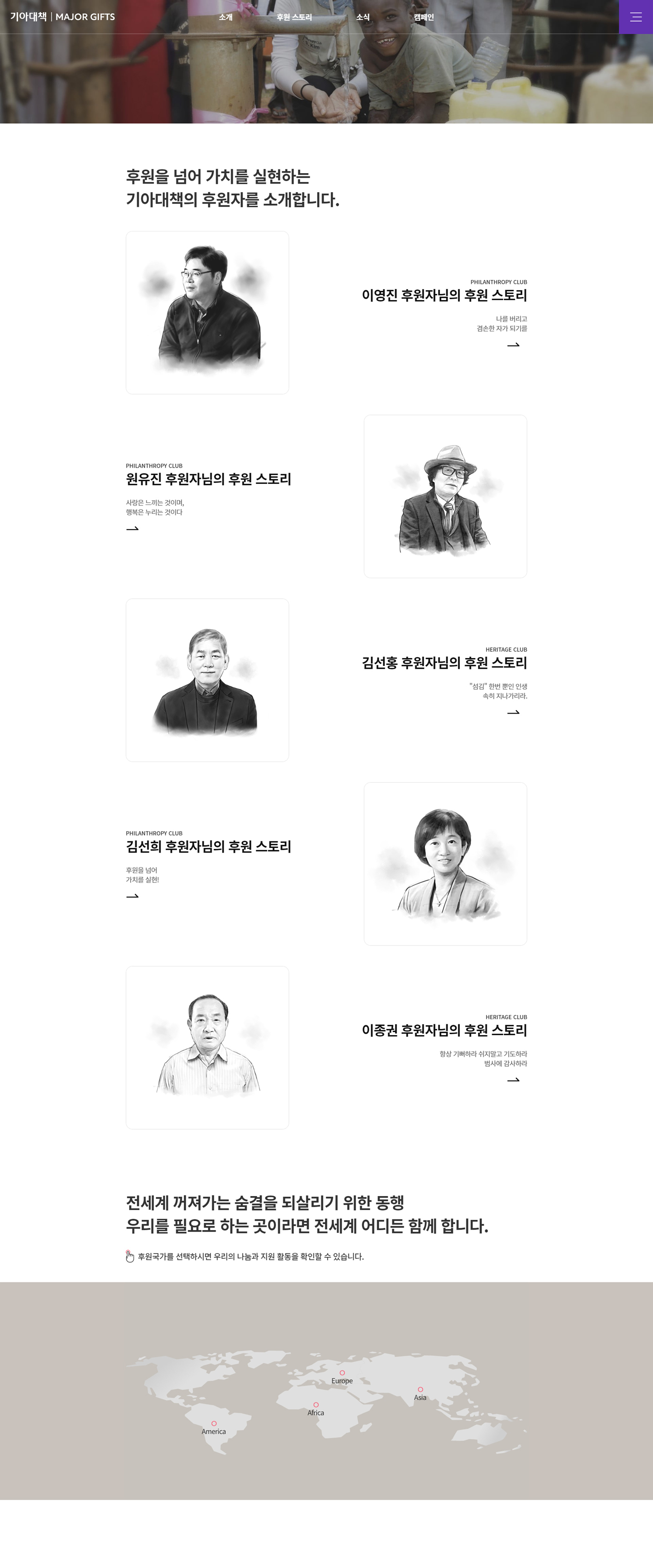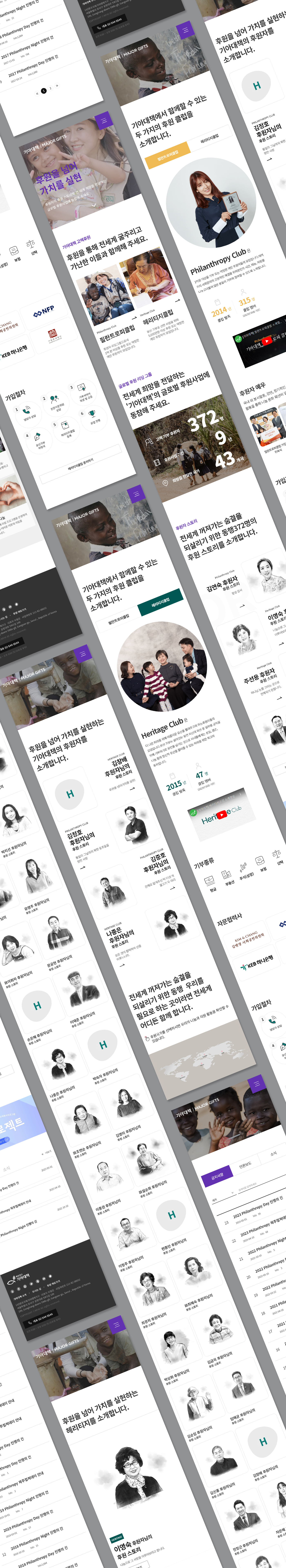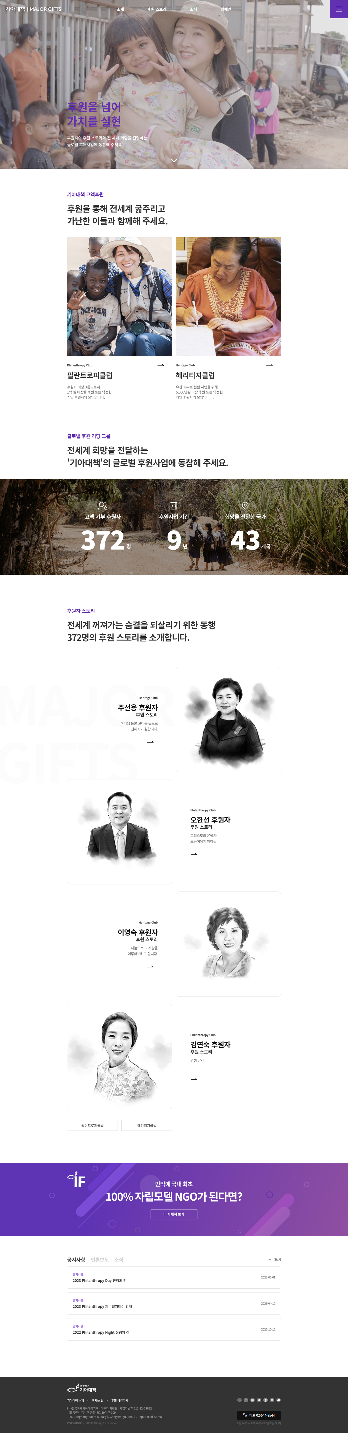 기아대책 MAJOR GIFTS 웹사이트는 기아대책의 여러 후원 중 고액후원자 클럽인 필란트로피(고액기부), 헤리티지(유산기부)의 기부 후원자를 예우하고 지원한 사업의 내용과 고액기부/유산기부를 하게 된 후원자 스토리를 구성하는데 중점을 두었으며, 기존의 2개의 독립된 사이트를 하나의 통합 웹사이트로 구축하고 데이터베이스를 이관하여 보다 효율적인 웹사이트로 개발하는데 중점을 두었습니다.