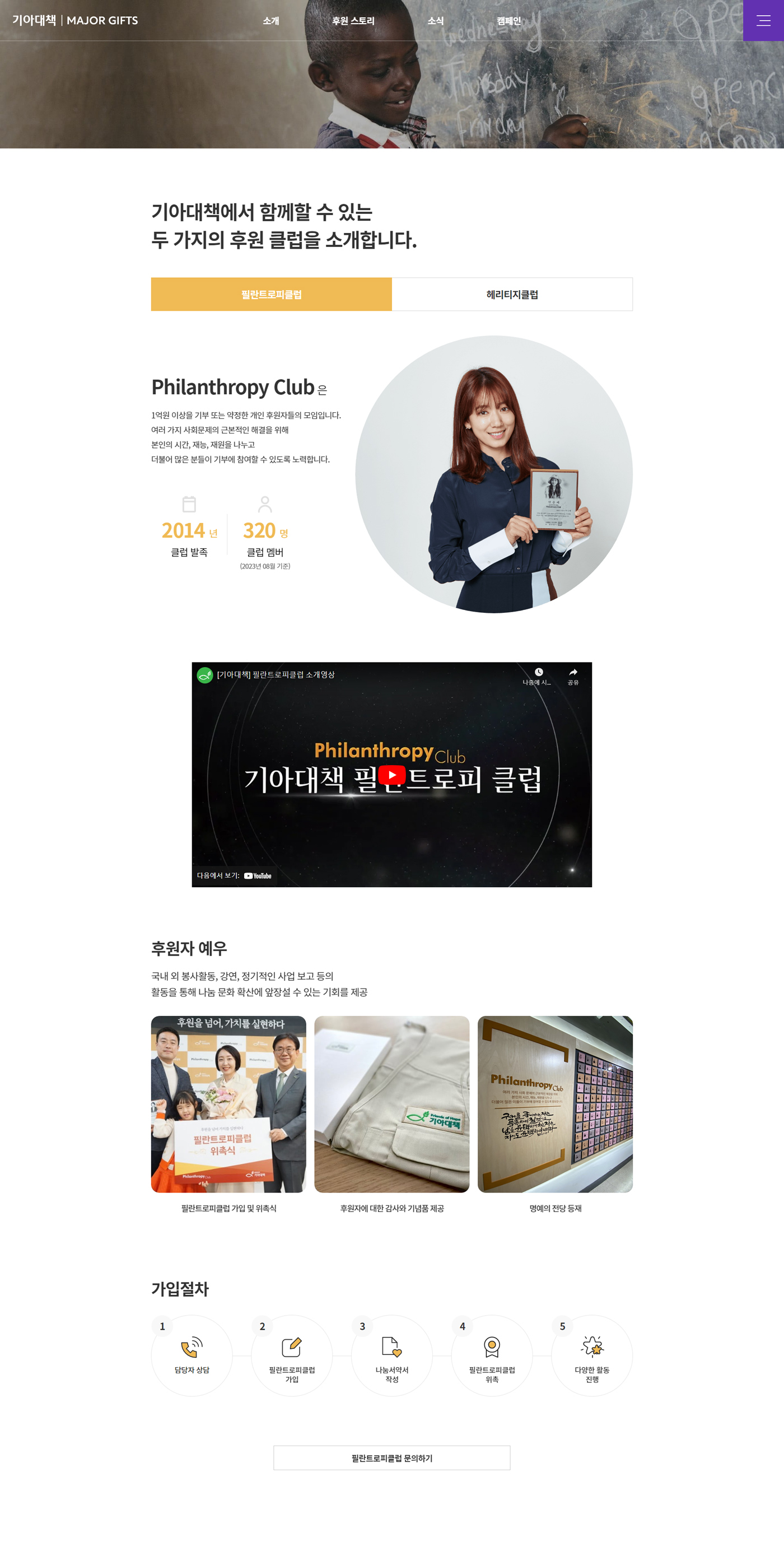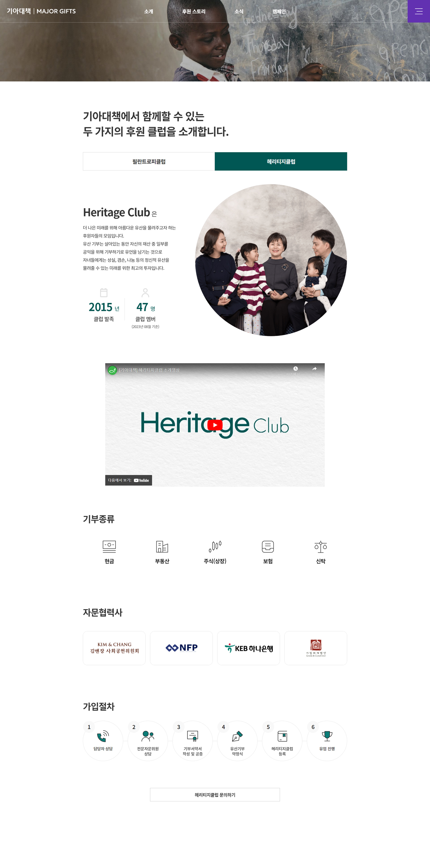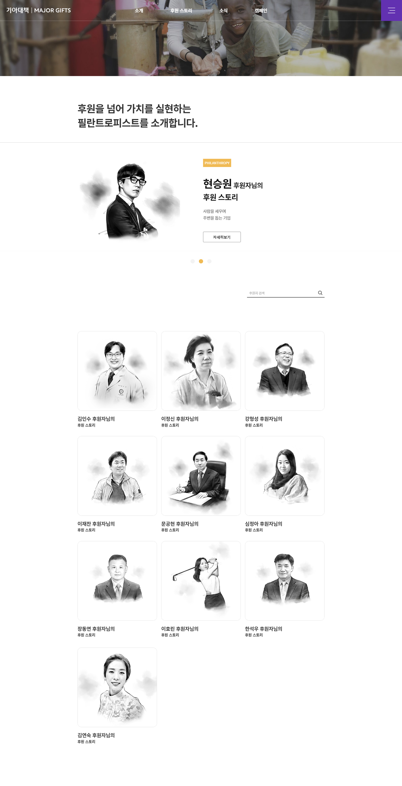 기아대책 MAJOR GIFTS 웹사이트는 기아대책의 여러 후원 중 고액후원자 클럽인 필란트로피(고액기부), 헤리티지(유산기부)의 기부 후원자를 예우하고 지원한 사업의 내용과 고액기부/유산기부를 하게 된 후원자 스토리를 구성하는데 중점을 두었으며, 기존의 2개의 독립된 사이트를 하나의 통합 웹사이트로 구축하고 데이터베이스를 이관하여 보다 효율적인 웹사이트로 개발하는데 중점을 두었습니다.