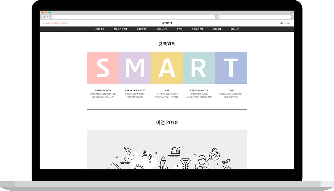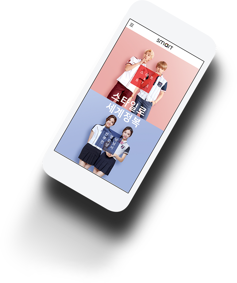 스마트학생복은 “스타일로 세계정복”이라는 2018 시즌 컨셉에 가장 최적화된 웹사이트로의 새로운 모습이 필요했습니다. 기존의 학생복 1위 업계라는 브랜드 위상을 유지함과 동시에 이번 프로젝트를 통하여 기존의 스마트학생복의 전통적인 브랜드 가치를 유지하는 동시에 새 컨셉에 적절한 비주얼 아이덴티티 및 브랜딩을 구축하고자하는 고객사의 니즈가 있었고, 이와 함께 고객 라이프 스타일에 맞춘 차별화된 서비스 제공을 위한 리뉴얼 플랜을 제시하게 되었습니다.