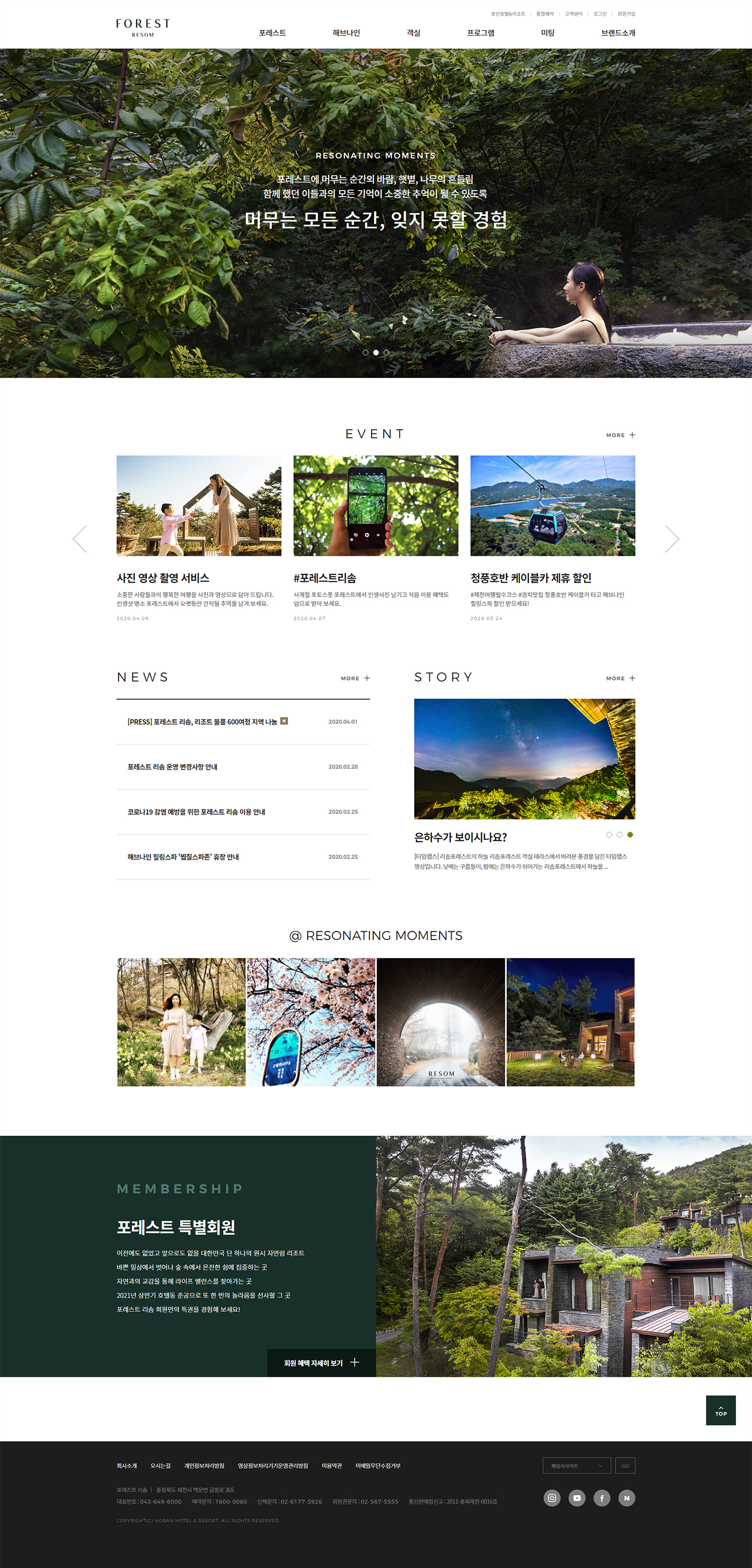 ​호반호텔 & 리조트는 호반그룹의 계열사로 다시 만날 수 없는 대자연과 상생하며 가치 있는 휴식과 감성 서비스를 선사하는 레저 문화 기업으로 제천의 포레스트 리솜, 안면도의 아일랜드 리솜, 덕산의 스플라스 리솜, 제주 퍼시픽 리솜을 운영 중입니다. 2019년 그룹 및 계열사의 CI와 각 브랜드의 통합 브랜드 아이텐티티 리뉴얼과 시설 및 서비스 변경으로 인해 호반호텔 & 리조트 첫번째인 포레스트 리솜의 웹사이트를 리뉴얼하였습니다.
