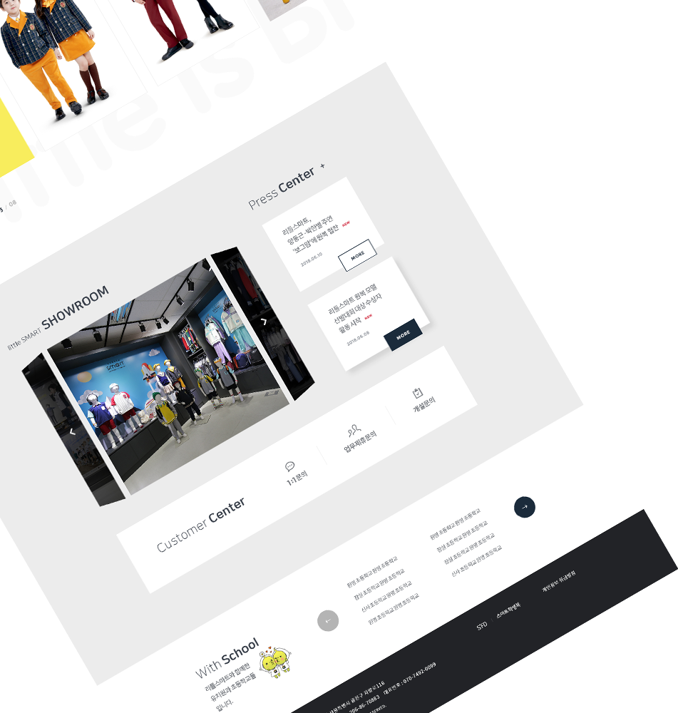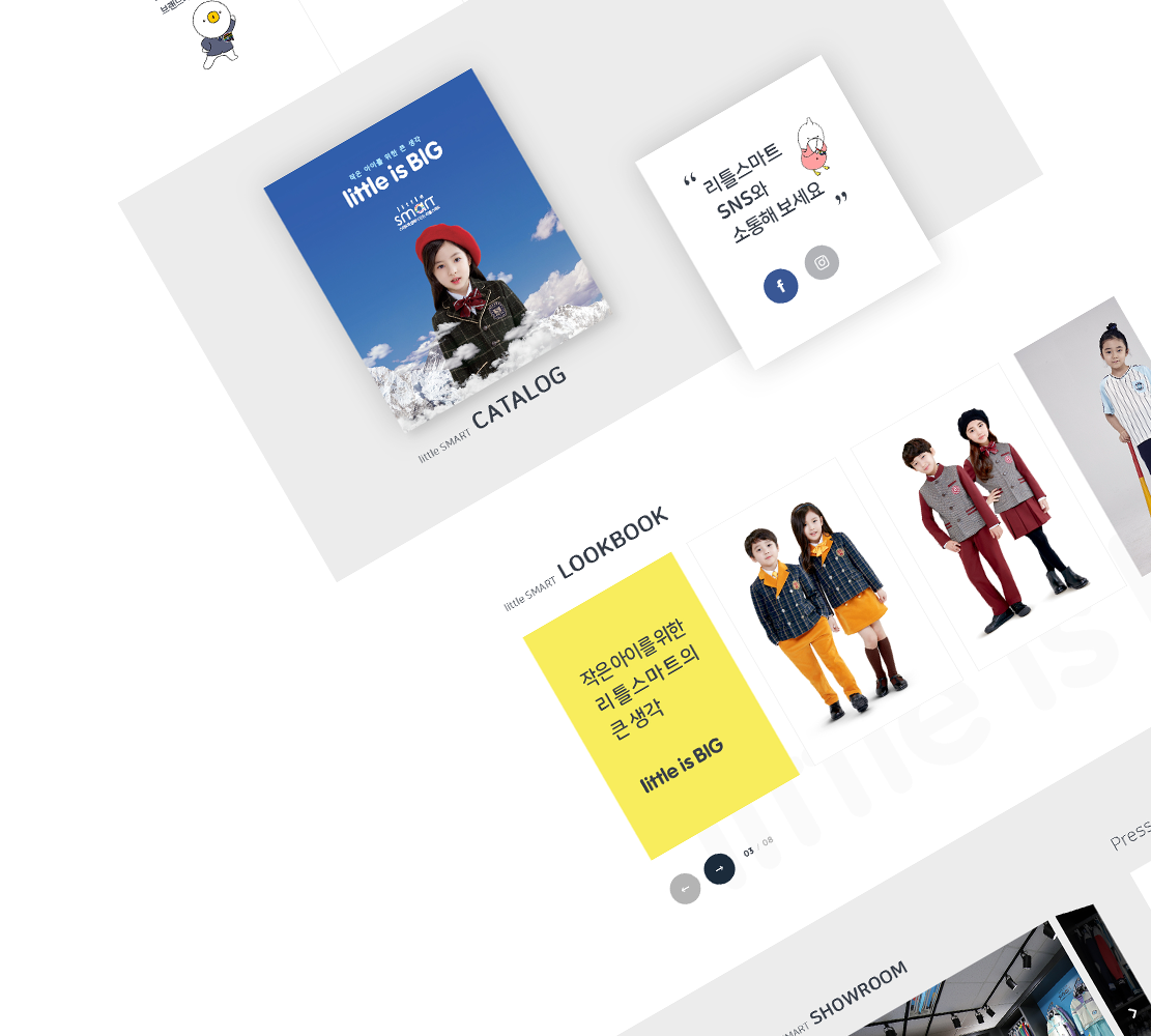 스마트학생복이 만든 프리미엄 원복 “리틀스마트”의 경우, ‘건강/안전/교육’을 중시하는 원복 브랜드로 학생복의 전통과 기술력 그리고 프리미엄 가치를 이어가는 컨셉의 홈페이지를 디벨롭 하고자 하였습니다.